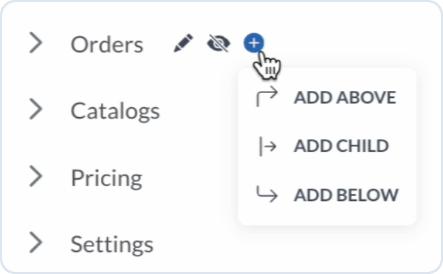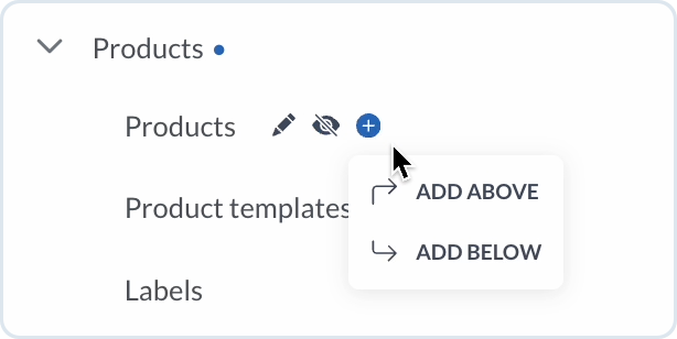 You can add existing or custom modules to the selected destination. When you hover over a module, the additional options menu appears. Choose **+** and decide where to add a new module - options depend on the selected level: