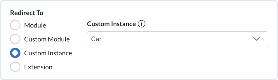 For greater customization, you can define where the module points to and where content is sourced from. The **Redirect to** allows the following options to point the edited module to: