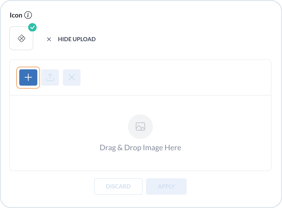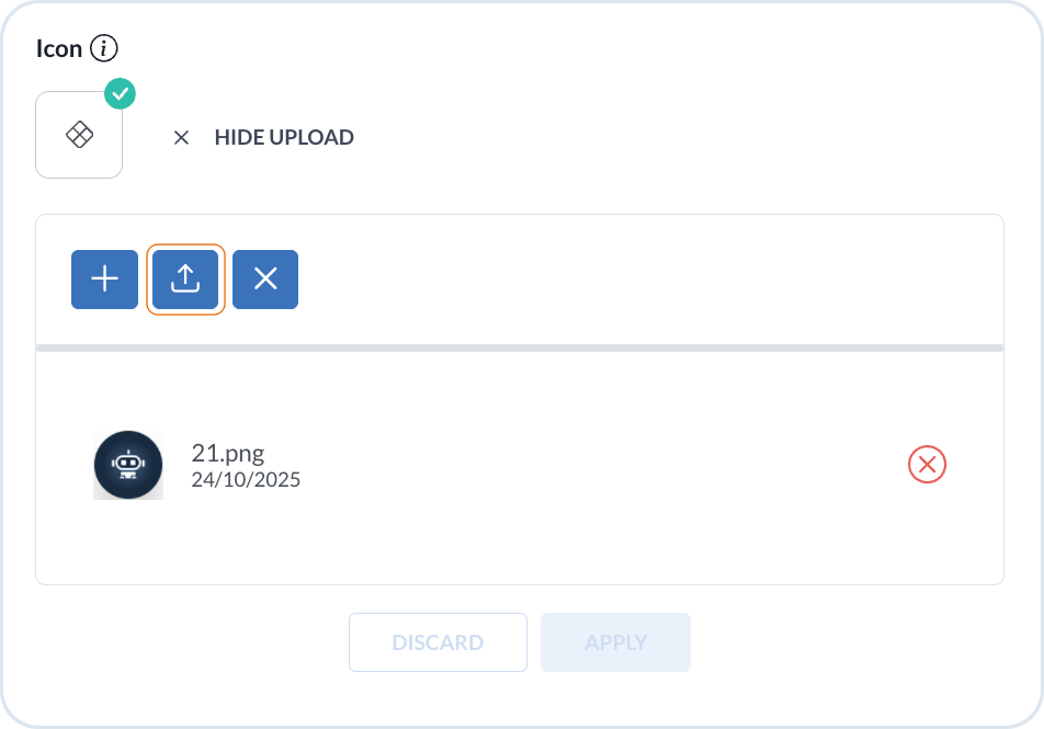 The root nodes can display custom icons. In the Edit mode, choose the **Upload icon** option. Then, using the **+** or drag and drop option, add the icon file from your device, and **Upload** it to the MD. When the icon is imported, you an select it as the module icon.