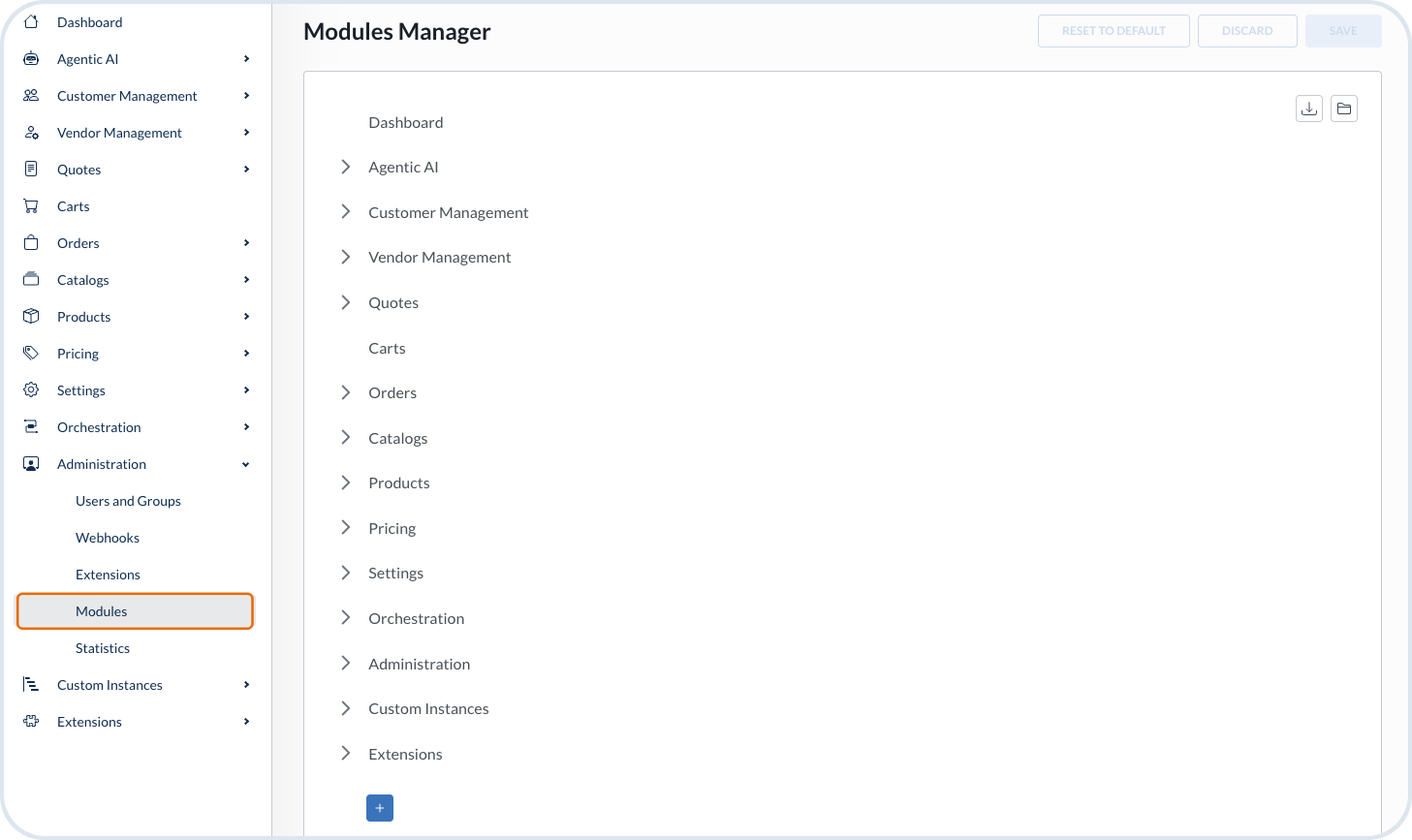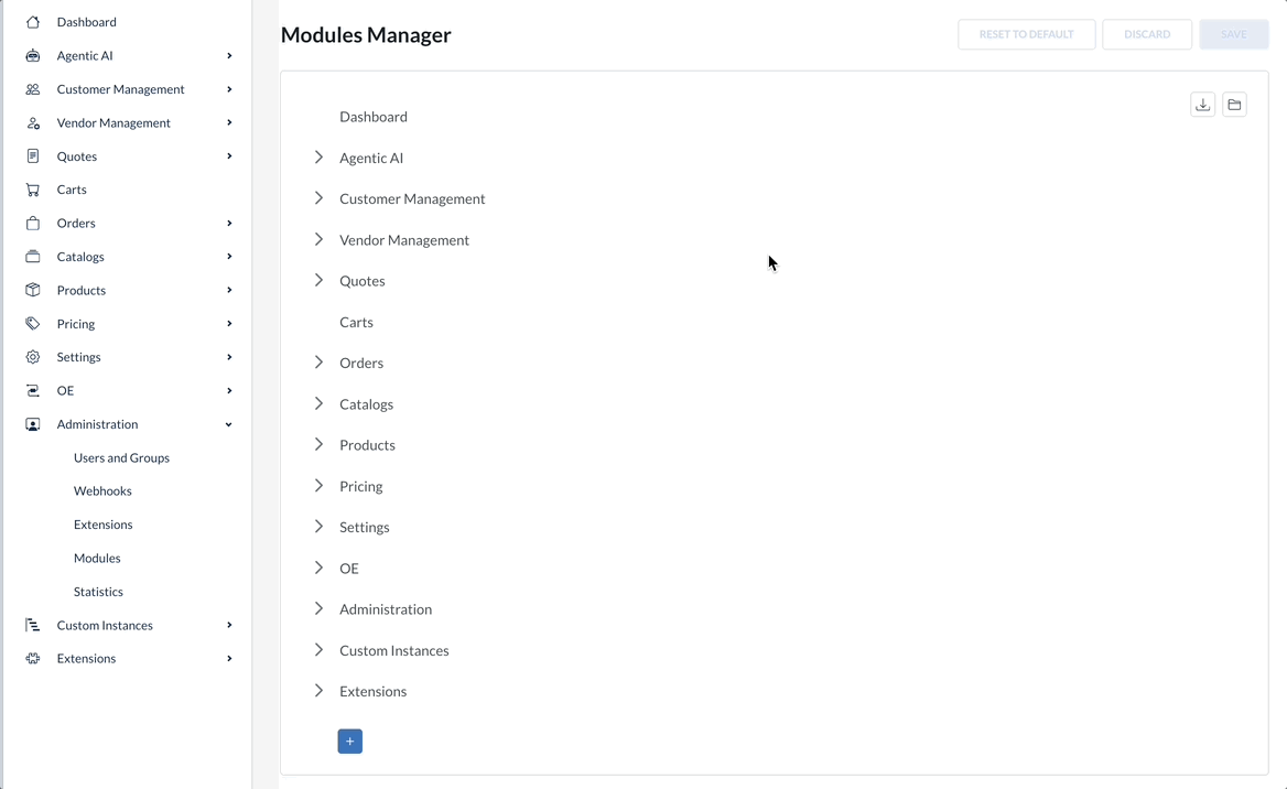 The **Modules Manager** section is the steering panel allowing you to adjust and customize the Management Dashboard navigation menu. Here, you can find different options to organize the Management Dashboard in a way it triggers full efficiency for your team and add customizations that adhere to your solution and style of working. The modules navigation structure takes effect for all tenant users.