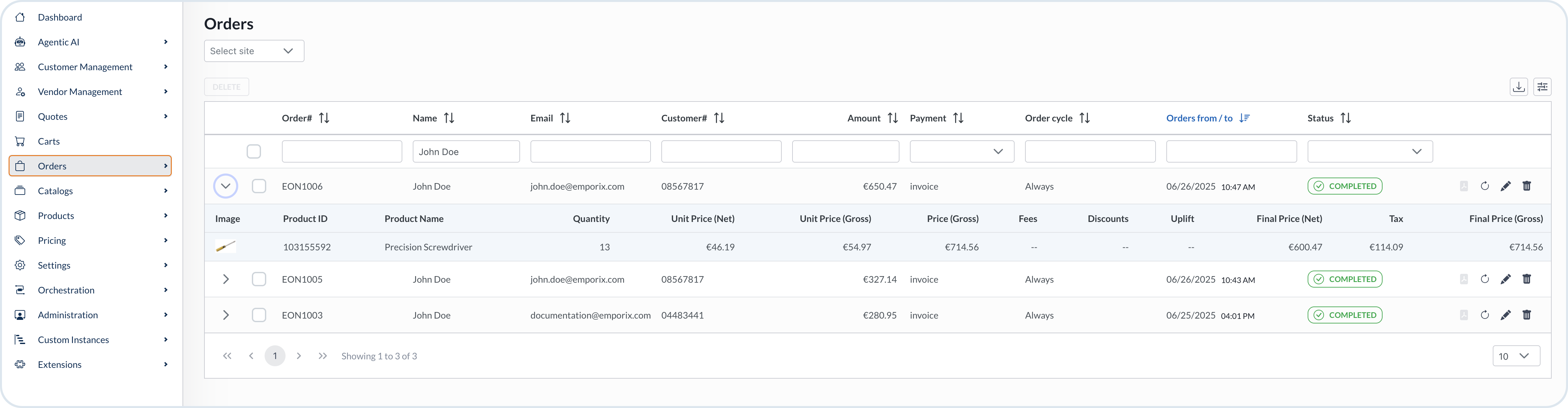 The **Orders** dashboard is where you can view a list of the orders placed at your store. You can either view all of the orders, or limit the view per site.