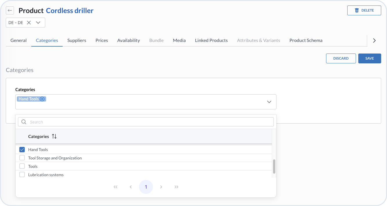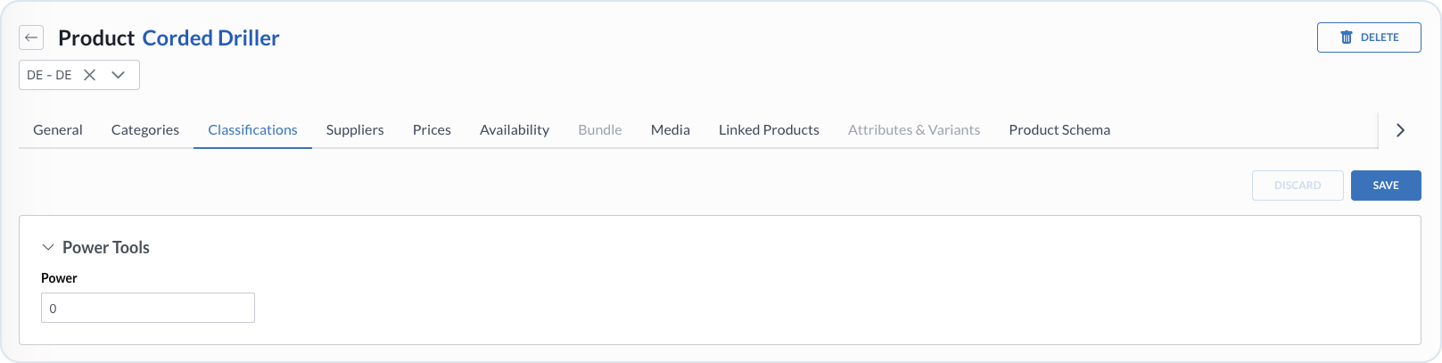 Classification categories can be assigned the same way as the standard ones. When you assign a product to a classification category, the product automatically receives all classification mixins defined for that category and its parent hierarchy. Those mixins add standardized attributes to the product, for example, technical specifications or warranty fields, so the product has a consistent structure and can be validated according to the classification schema.
