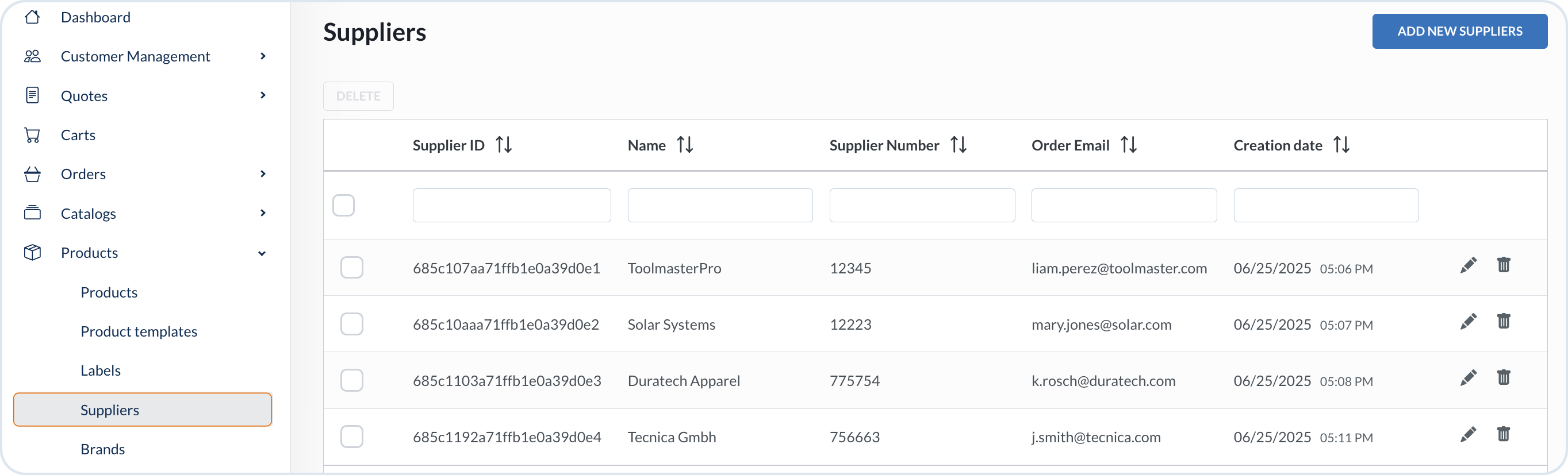 You can filter the list of your suppliers by supplier ID, name, supplier number, order email or creation date.