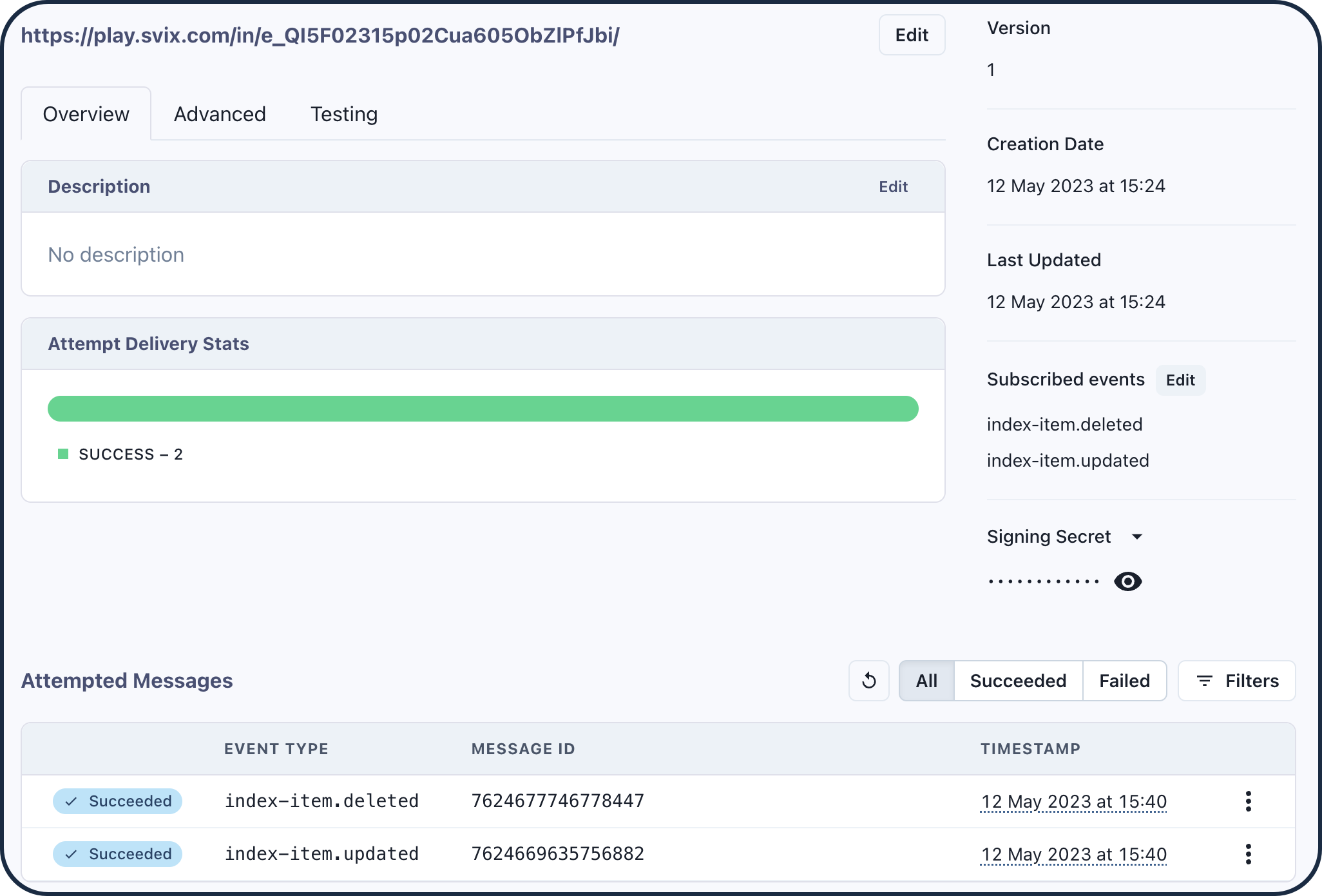 After a few minutes, you should see the updated delivery statistics in Svix.