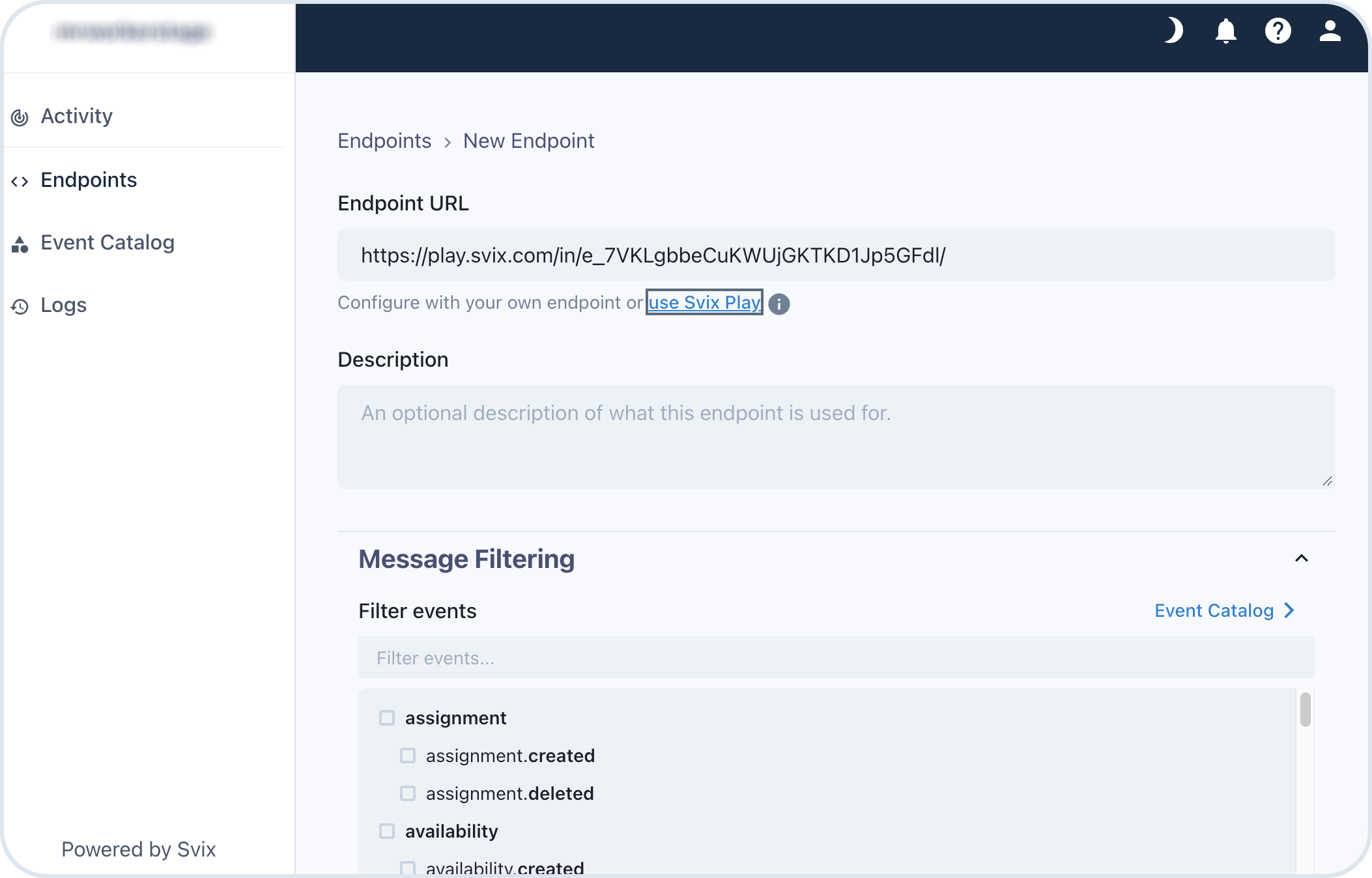 2. Go to Svix by choosing the **Open Svix Dashboard** button.