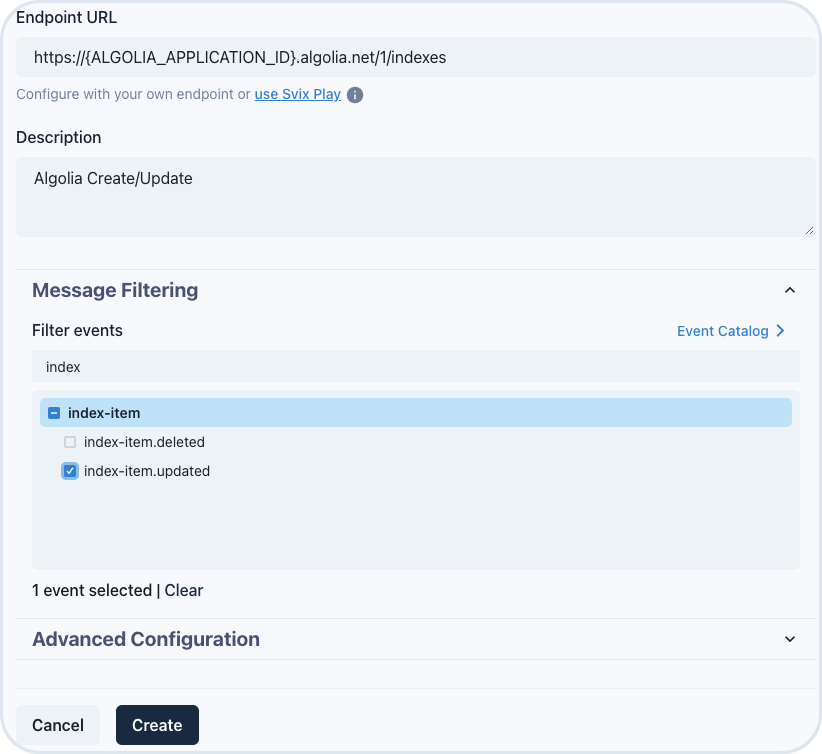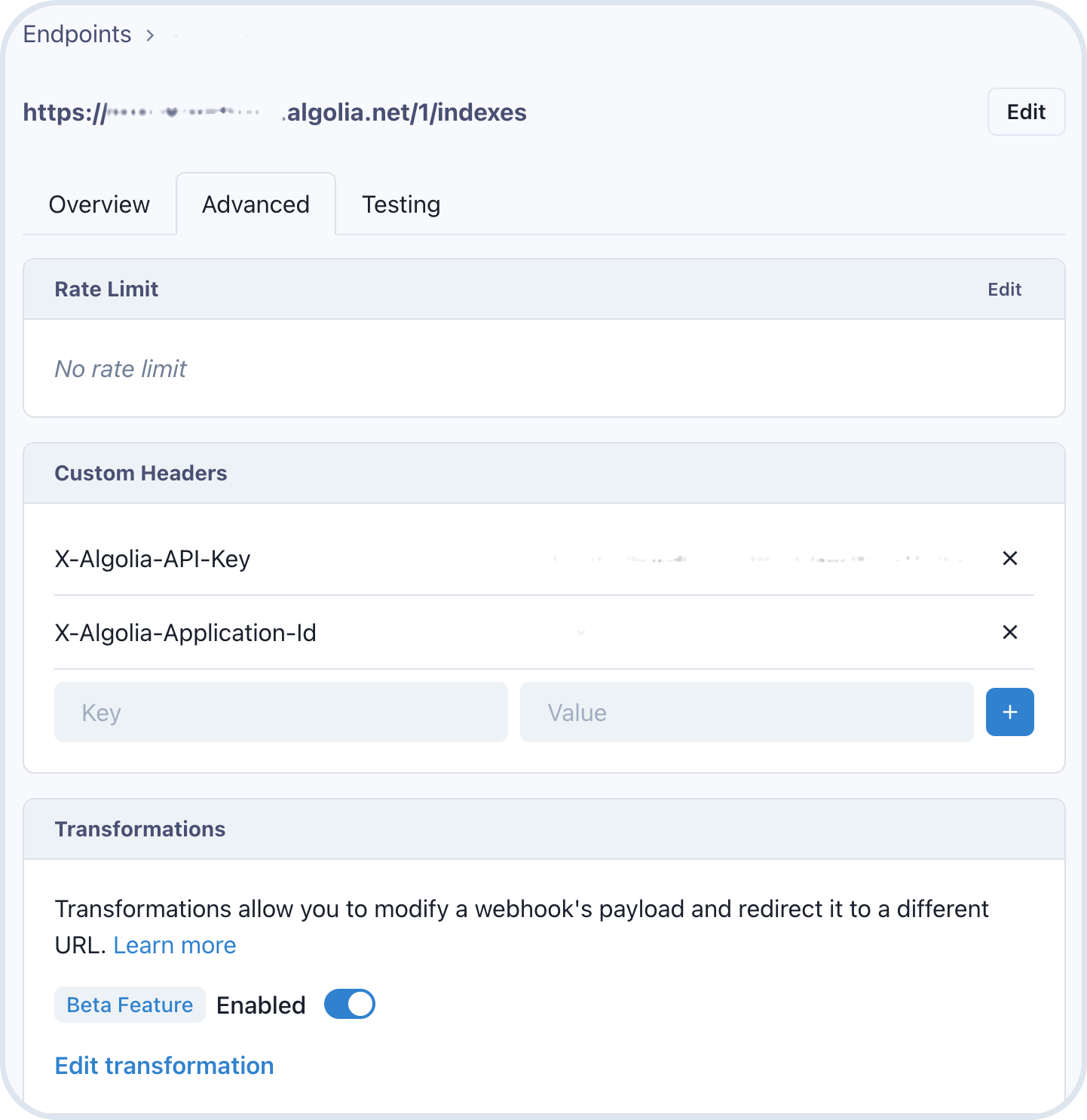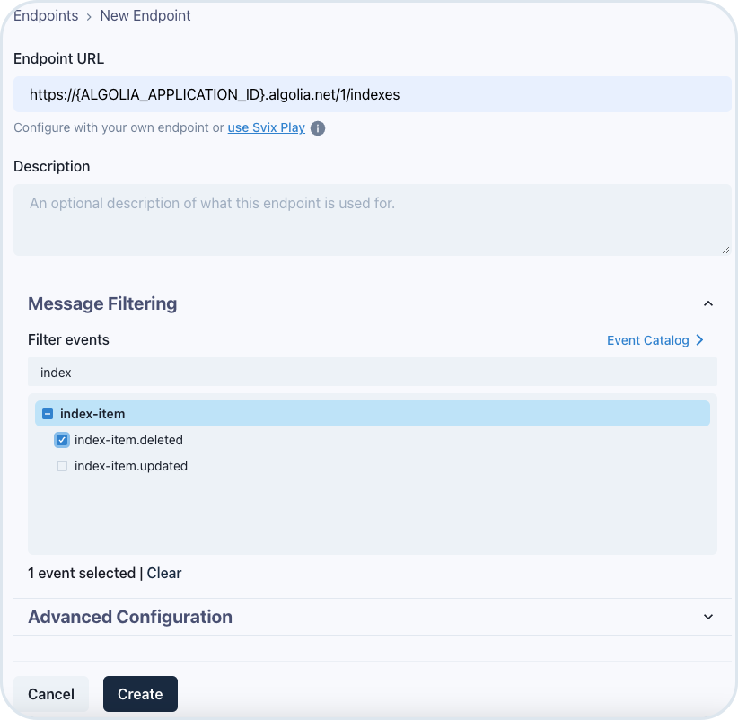 * Endpoint URL - `https://{ALGOLIA_APPLICATION_ID}.algolia.net/1/indexes` - provide your Algolia application ID