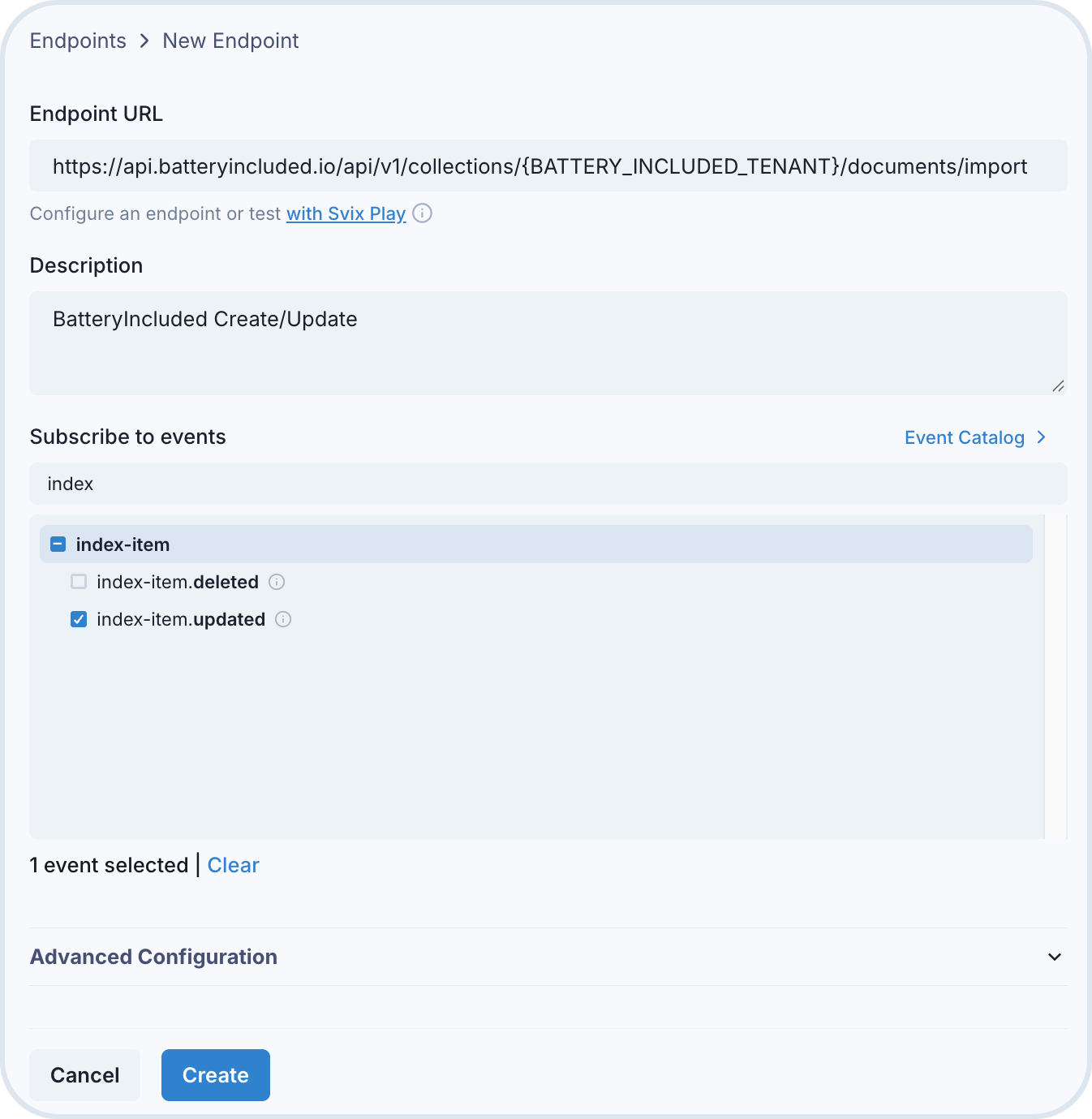 To test the configuration, create a product in Management Dashboard and after a few minutes check if it appears in your index in the BatteryIncluded account. With this configuration, every time when a product is created or updated, the appropriate event is propagated to Svix, transformed and then sent to BatteryIncluded.
