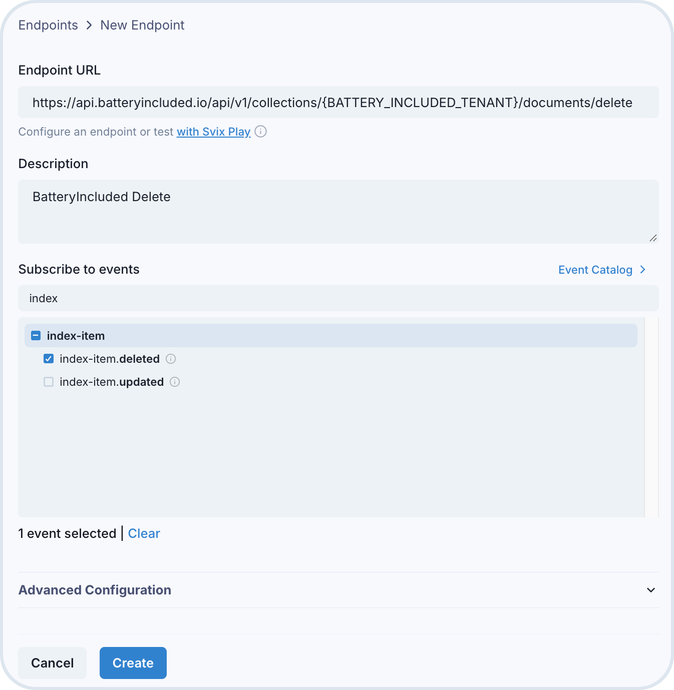 To test the configuration, delete a product in Management Dashboard and after a few minutes check if it was deleted in your index in the BatteryIncluded account. With this configuration, every time when a product is deleted, the appropriate event is propagated to Svix, transformed and then sent to BatteryIncluded.