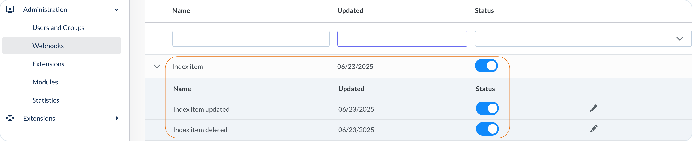* Enable the **Index item updated** and **Index item deleted** events are enabled in Management Dashboard, see [Enabling webhook service](#enabling-webhook-service).