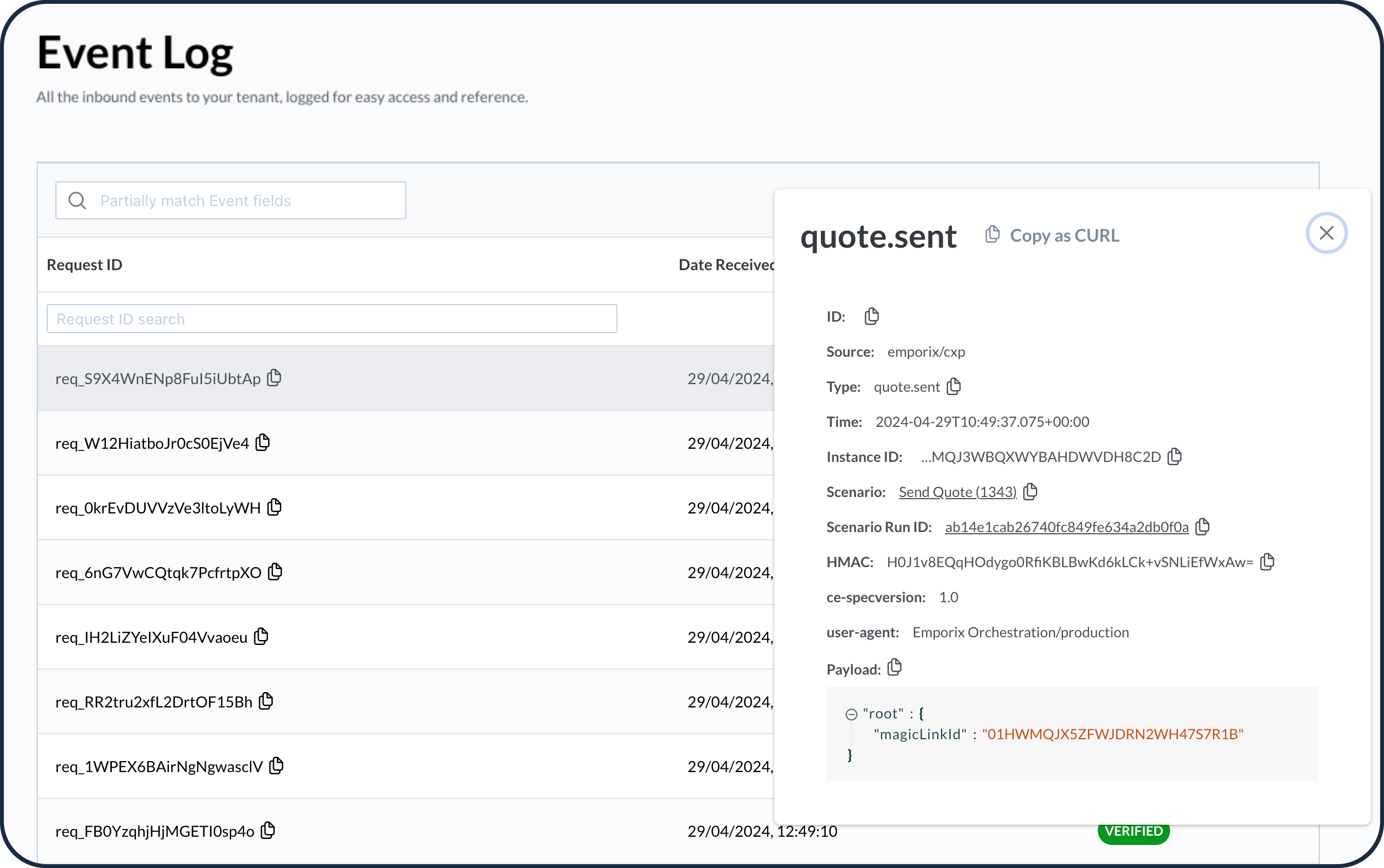 Logs details also allow to get all of the event information in a CURL format, use the Copy as CURL for that.