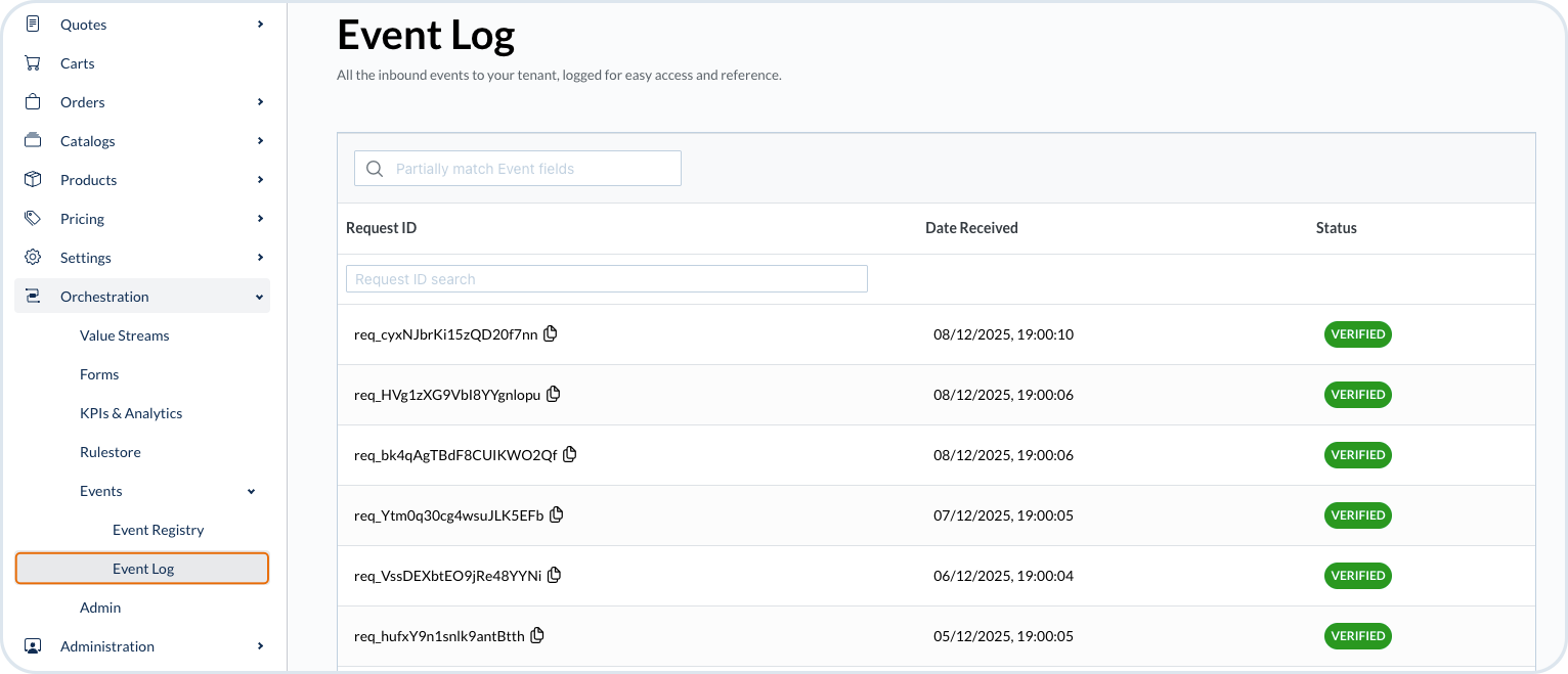 In the OE Event Log main view, you can check records of all the events that were received for your value stream. You can search the results with the Request ID for which the event occurred. You can also see when the data was received and whether the call was successful.