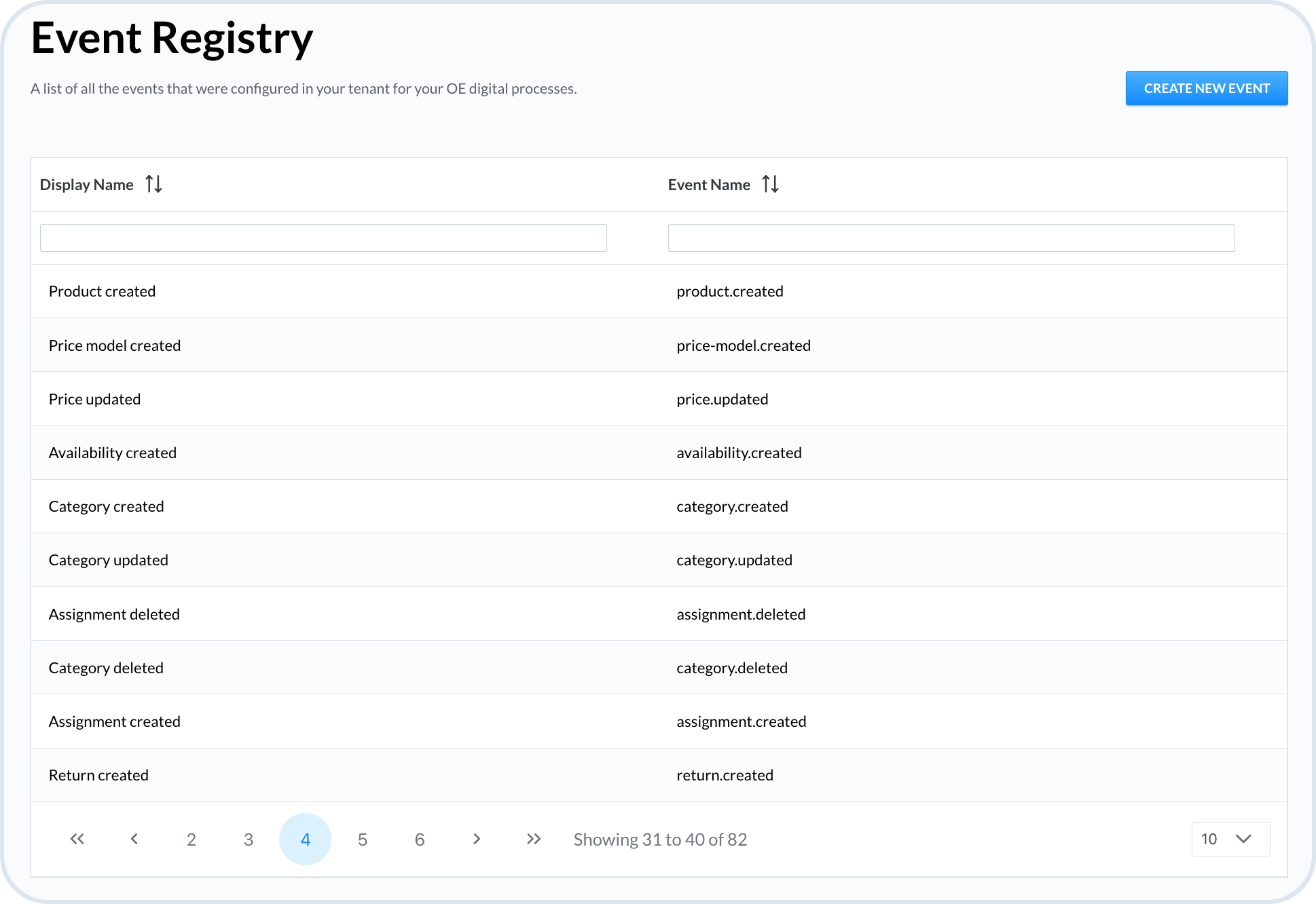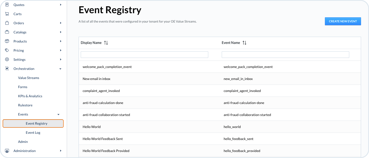 Event Registry is a list of all the events that were configured in your tenant for your OE value stream. The events are the triggers that initiate the processes and make them run.