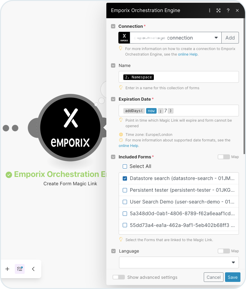 3. Datastores are authenticated with Magic Links. You can add the **Create Form Magic Link ID** module in a Make scenario and in the **Included Forms** select the form that you'd prepared for the datastore search. The module creates a link to the form that is used in the **List Values in a Datastore** module. You can add it in the same scenario or create a new one only for searching the data.
