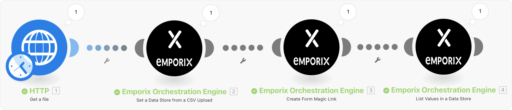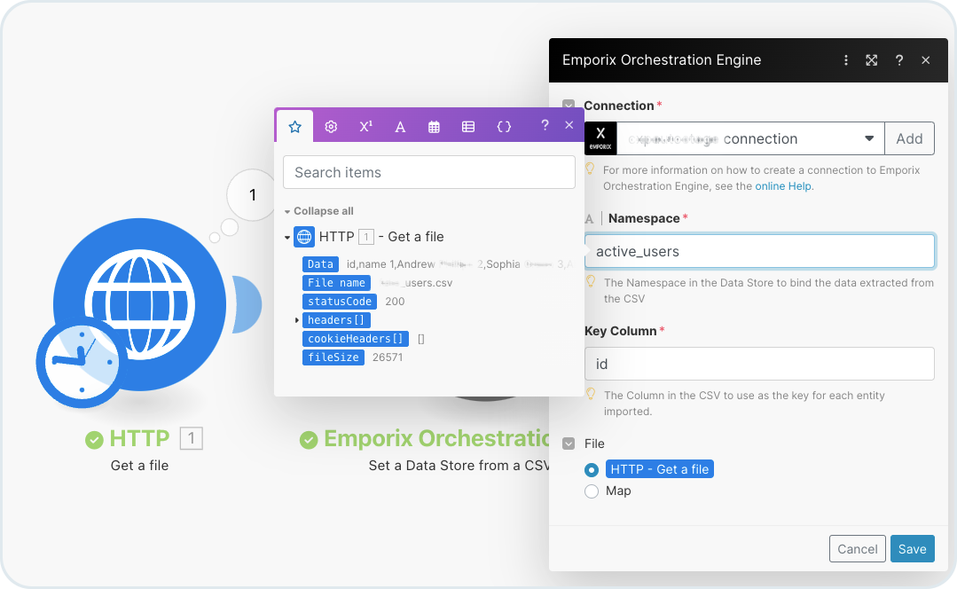 1. Start with populating a datastore through the **Set a Datastore from a CSV Upload** module in Make. The supported file format for the data is CSV. To pull the CSV file, you can create a scenario in Make with relevant modules.
