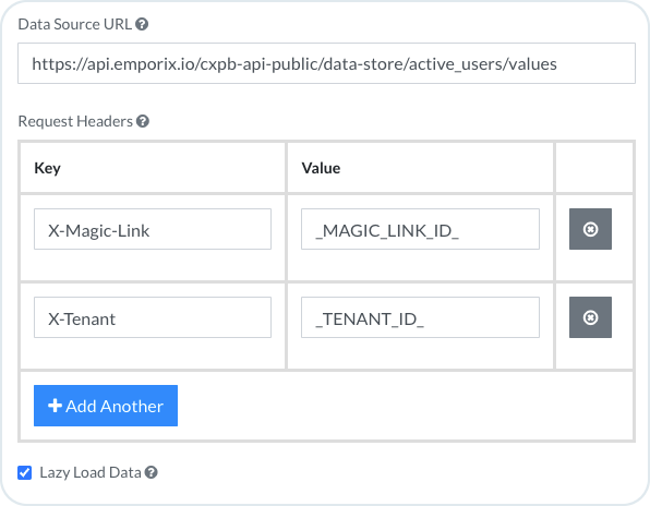 * Choose **URL** for the **Data Source Type** and paste the URL in the **Data Source URL** field. The variable in the URL is your datastore name from the **Set a Datastore from a CSV Upload** module, for example: `https://api.emporix.io/.../data-store/active_users/values`.