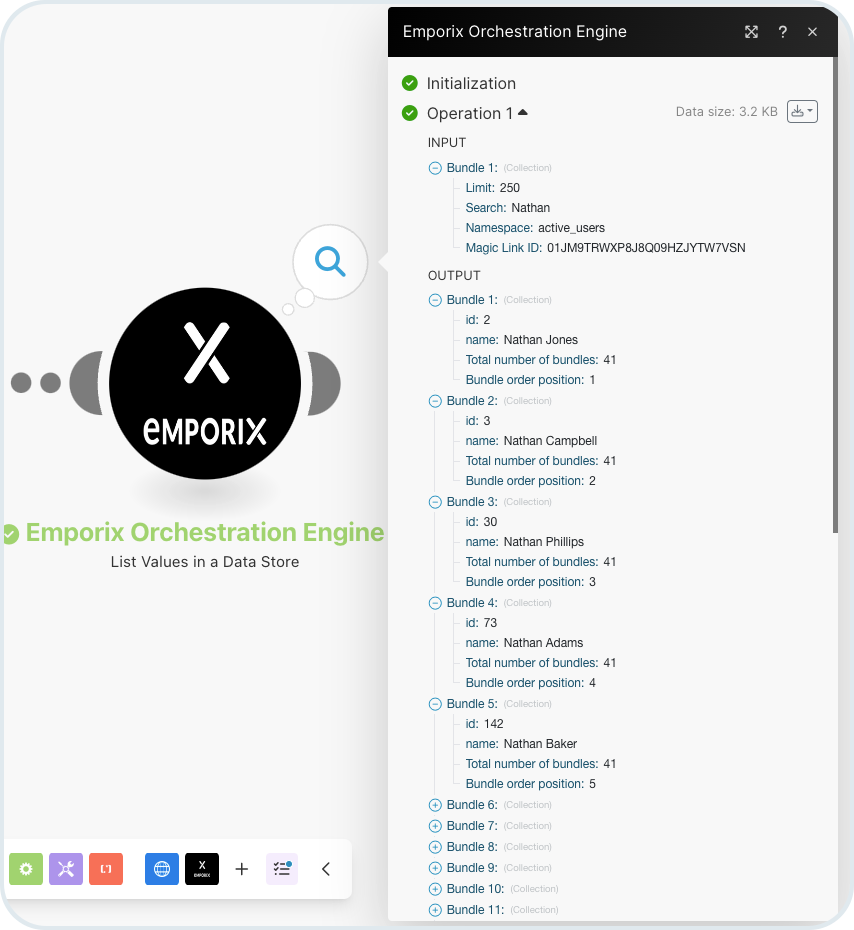 5. Run the scenario. If the run is successful, you can see the search results in bundles, in the **List Values in a Datastore** module output. See the returned demo data:
