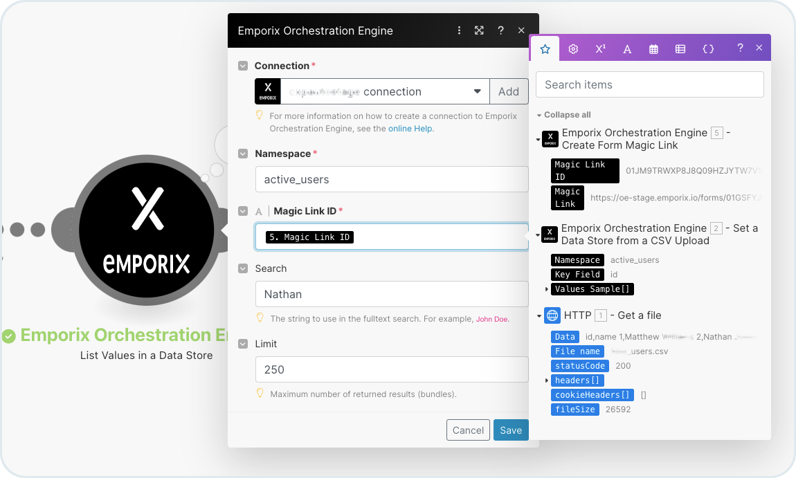 * Run the scenario, it populates a datastore with all the information from the uploaded file, for example with active users. By default, there are up to 100 entries that are displayed in the response, but the datastore can include more than that.