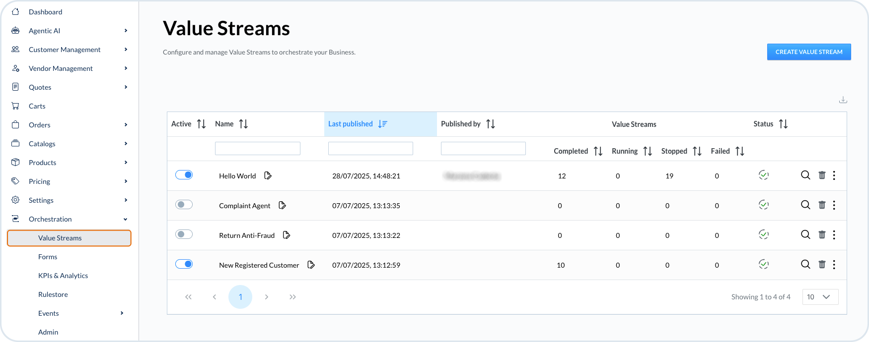 What you can see in the page is a list of all the value streams that are created in your tenant. You can manage the value streams by creating new ones or deleting those which are no longer needed, activating or inactivating the ones which already exist.