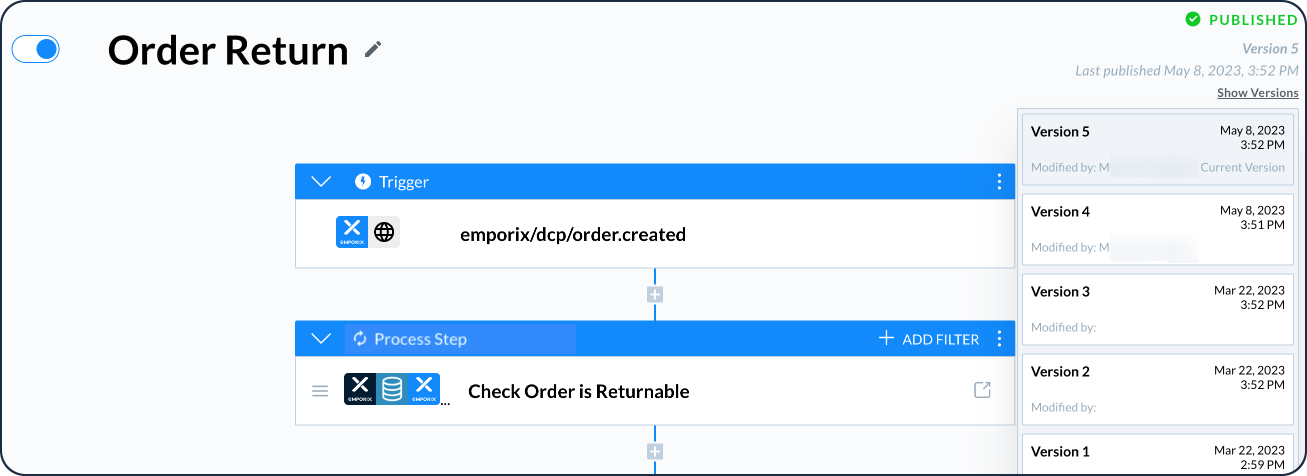 Additionally, using the **Show Versions** function, you can check what is the current value stream version, when it was modified and by whom. You can also select the previous version of the value stream and get back to it.