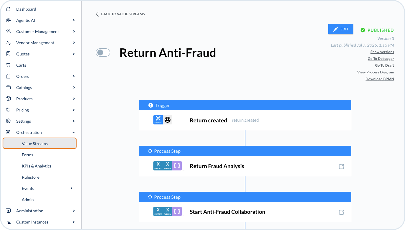 * **Go to Debugger** - this allows you to move directly to the debug mode to check all the logs of your value stream instances. For debugger details, see [Value Stream Debugger](https://developer.emporix.io/oe/troubleshooting/value-streams-debugger).