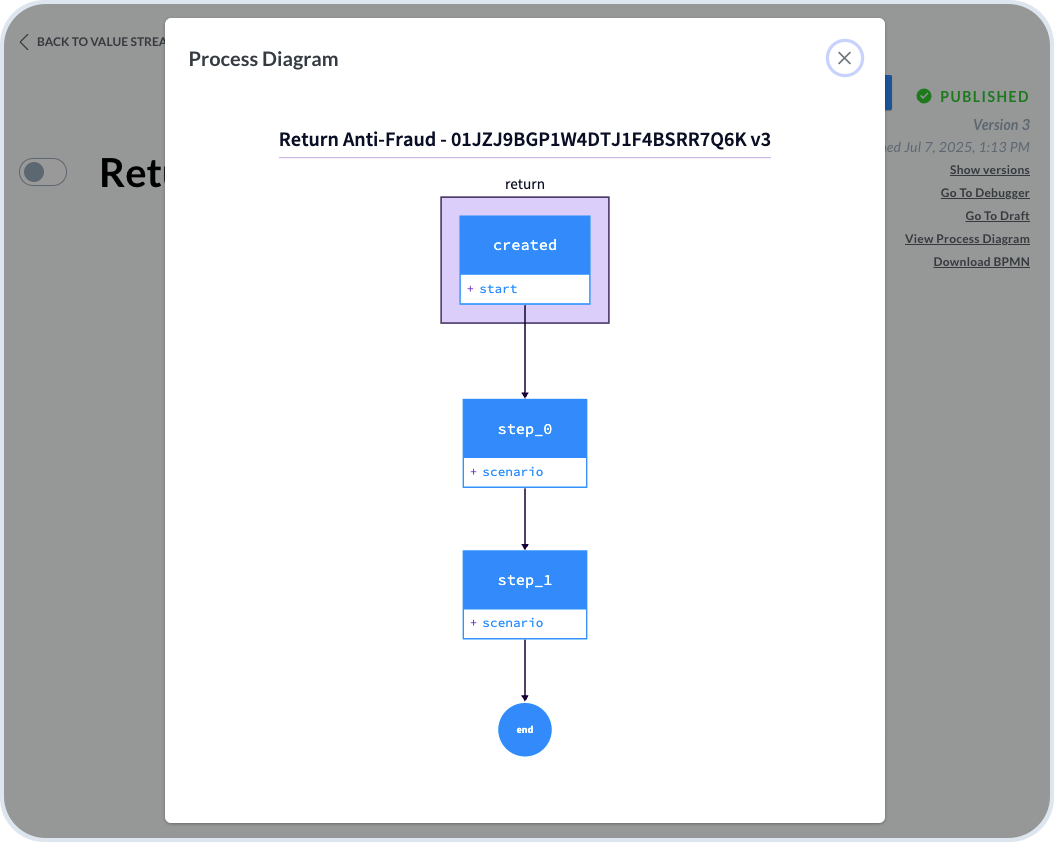 * **View Process Diagram** - this allows you to display a diagram representing your value stream workflow, you can see the triggers and steps where Make scenarios are used. The diagram includes the name of the process, it's ID and version number.