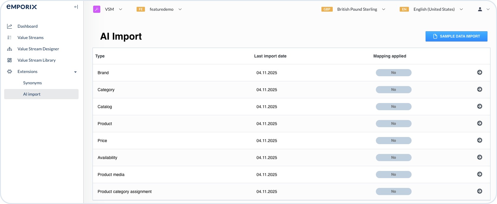 * **AI SmartImport** - it helps in the data upload and integration process by automatically importing information such as brands, categories, catalogs, products, prices, media, availability, taxes, and product category assignments. It maps the content from uploaded files to the system’s data structure, eliminating manual mapping. For details, see the [AI Smart Import](https://app.gitbook.com/s/8GgoeZEZYjZrpjOU6w52/ai-in-emporix/ai-intro/ai-import "mention") guide.